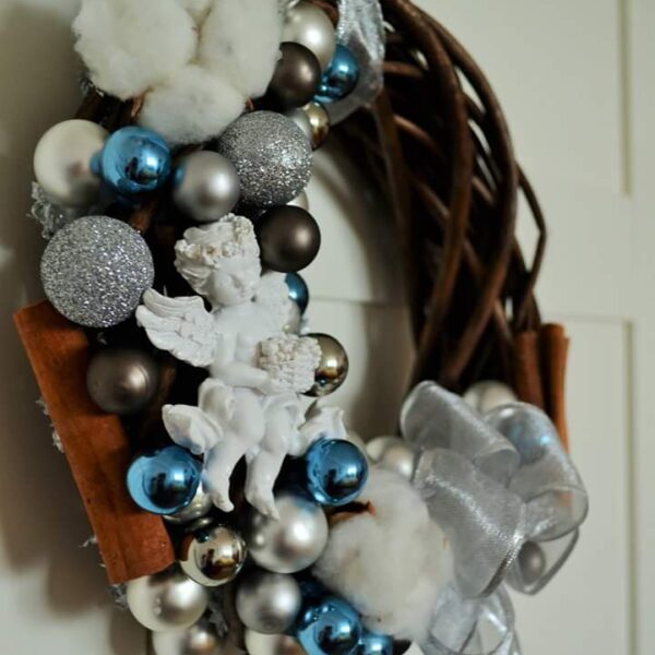 TIP PRODUS: Coroniță pe cadru de lemn, cu bumbac natural și scorțișoară, globuri albastre și gri.