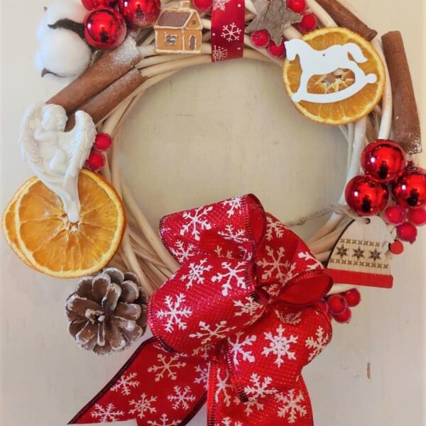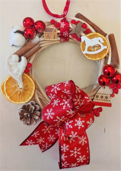 TIP PRODUS: Coroniță pe cadru de lemn, cu bumbac natural și scorțișoară, globuri roșii și elemente natur.
