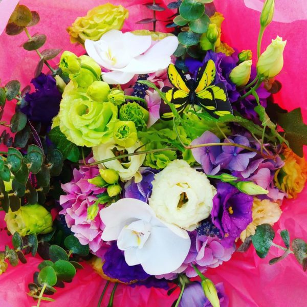 Buchet eustoma, phalaenopsis si hortensie in nuante delicate de verde mar, mov aprins si rozuri calde.